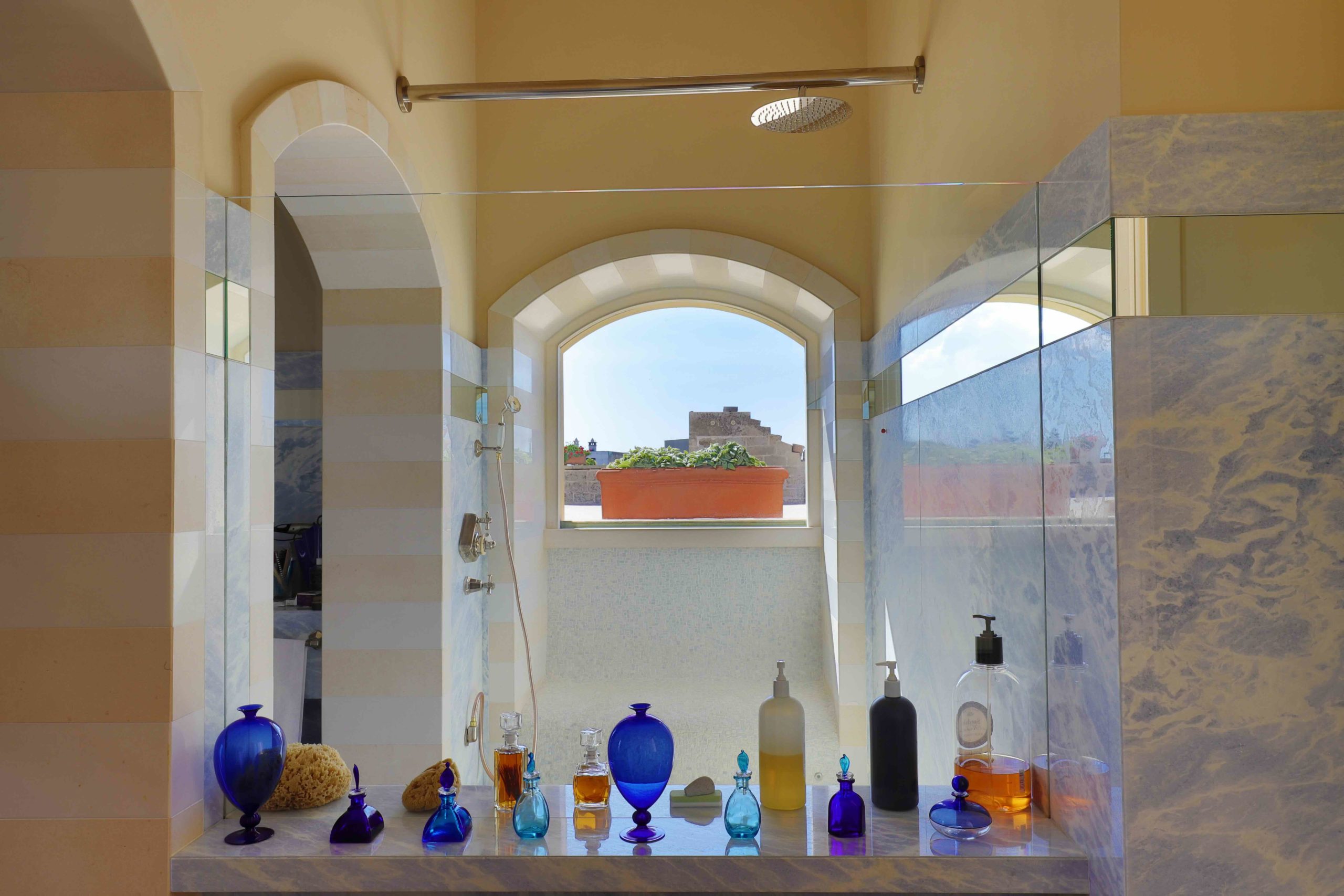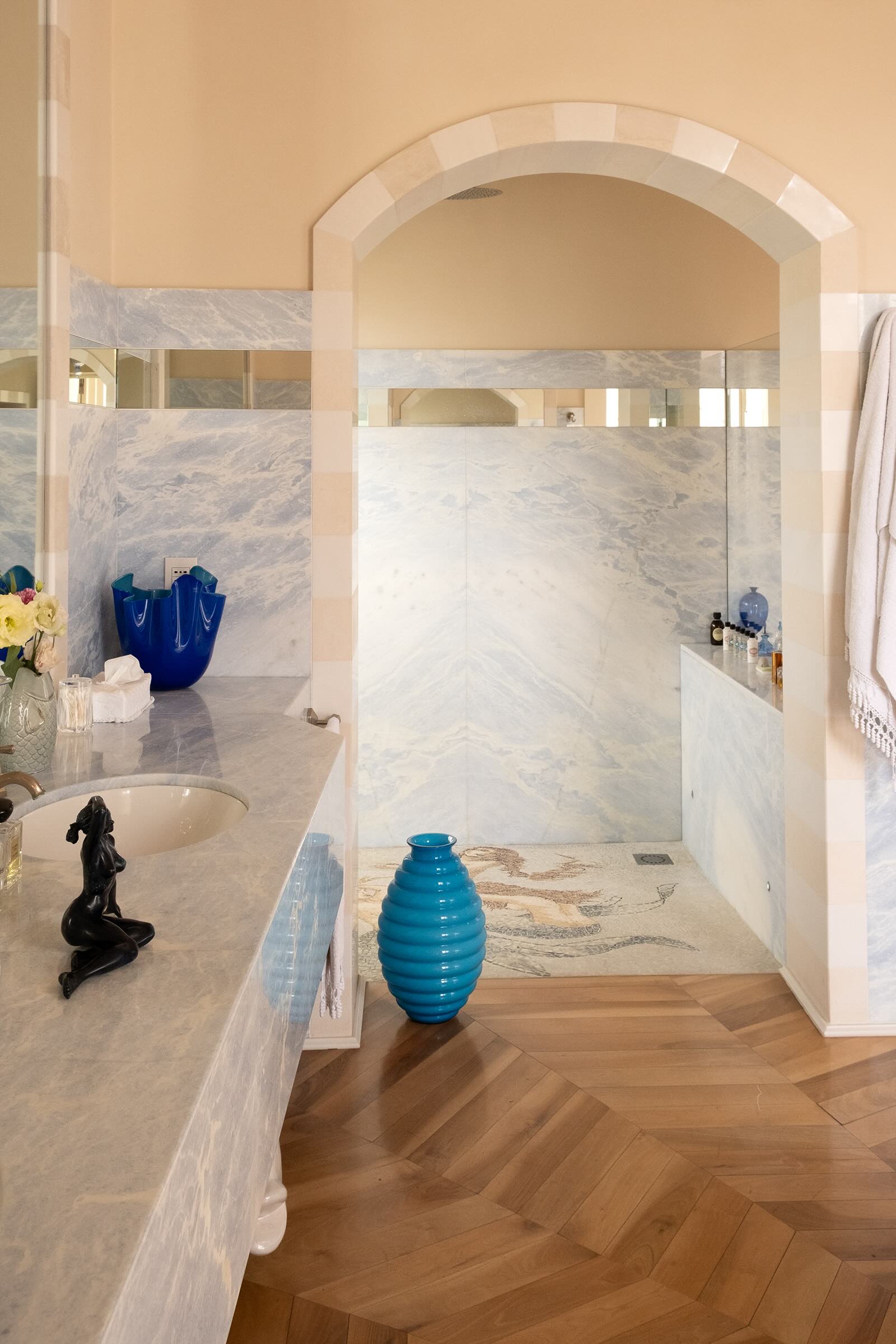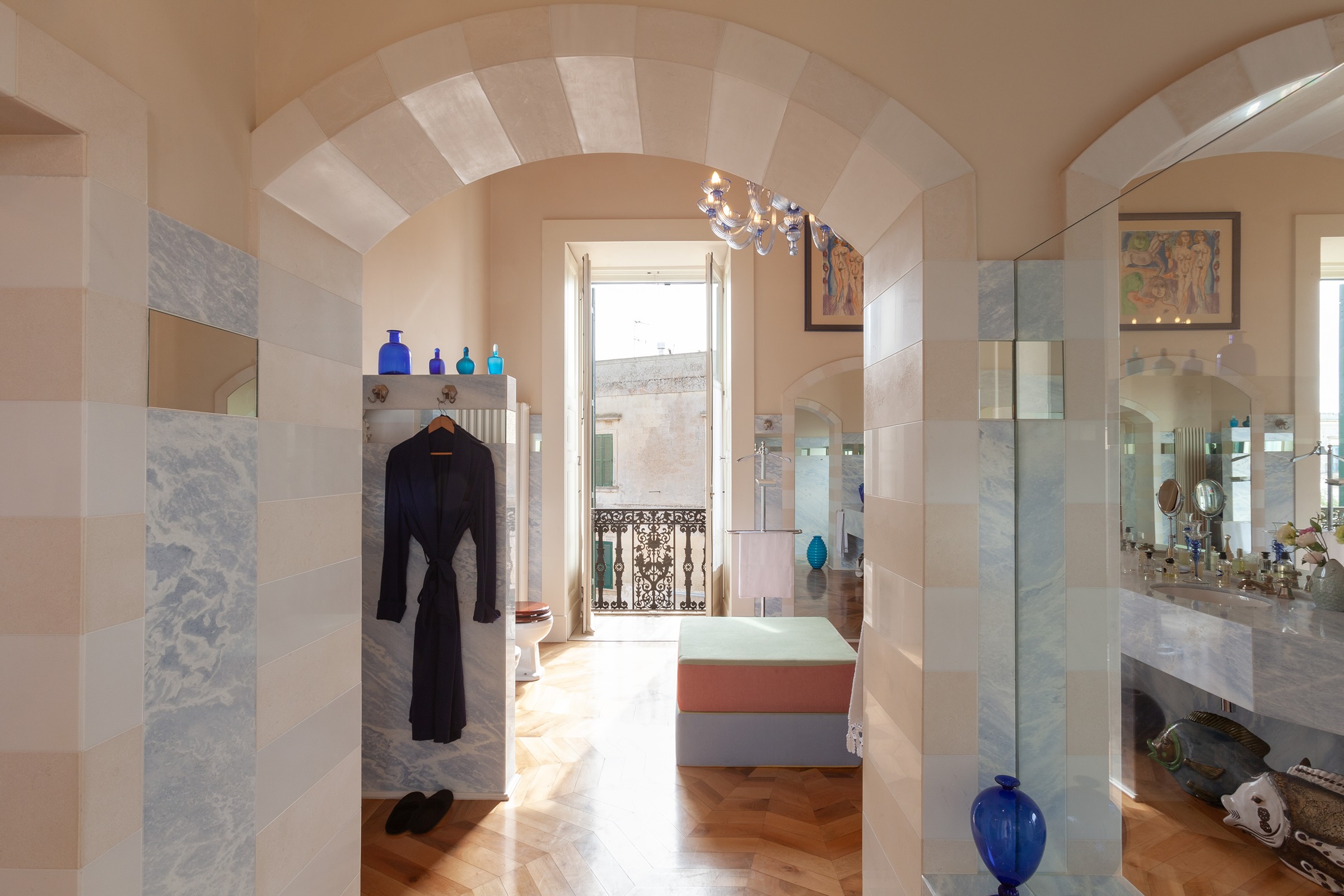 Il bagno en suite, ampio e scenografico, è realizzato in pregiato marmo chiaro e dotato di doppio lavabo, grande specchiatura e dettagli decorativi che richiamano lo stile del Palazzo. L’atmosfera è quella di una elegante sala da bagno d’epoca reinterpretata in chiave moderna.