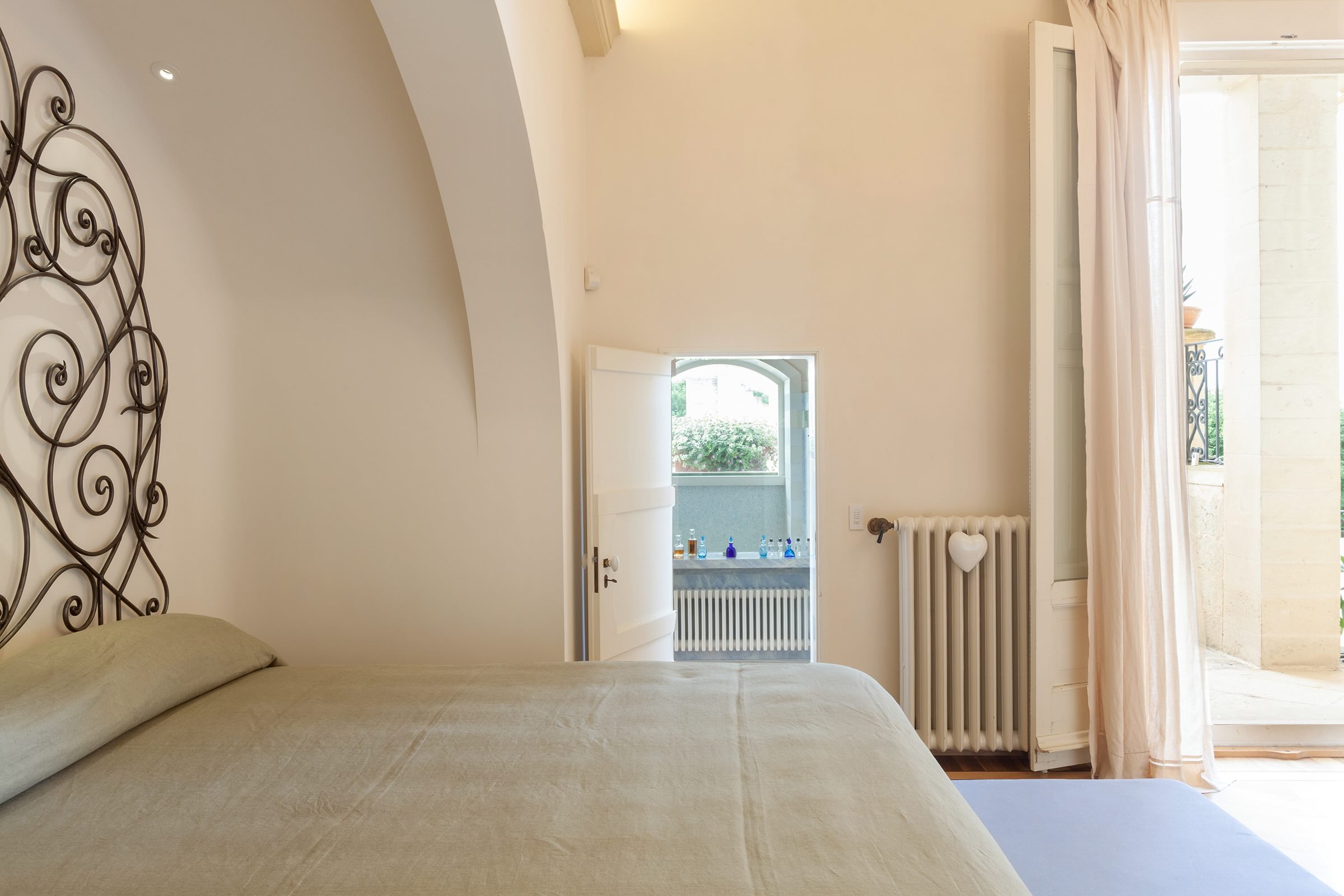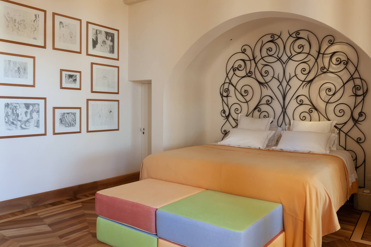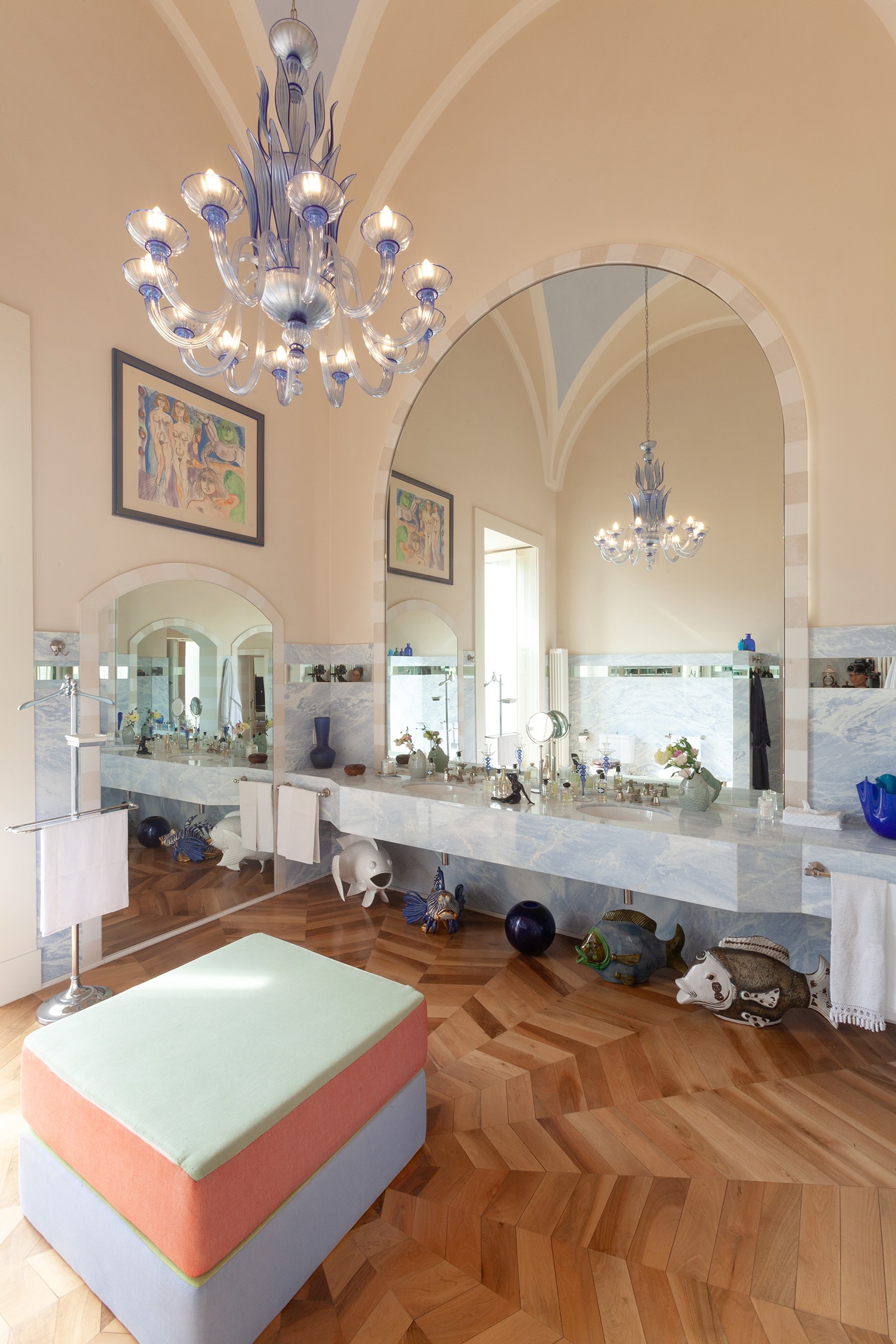 The en suite bathroom is spacious and striking, crafted in fine light marble and equipped with double sinks, large mirrors, and decorative details that echo the Palazzo’s distinctive style. The result is a luxurious, modern reinterpretation of a classic Italian bathhall.