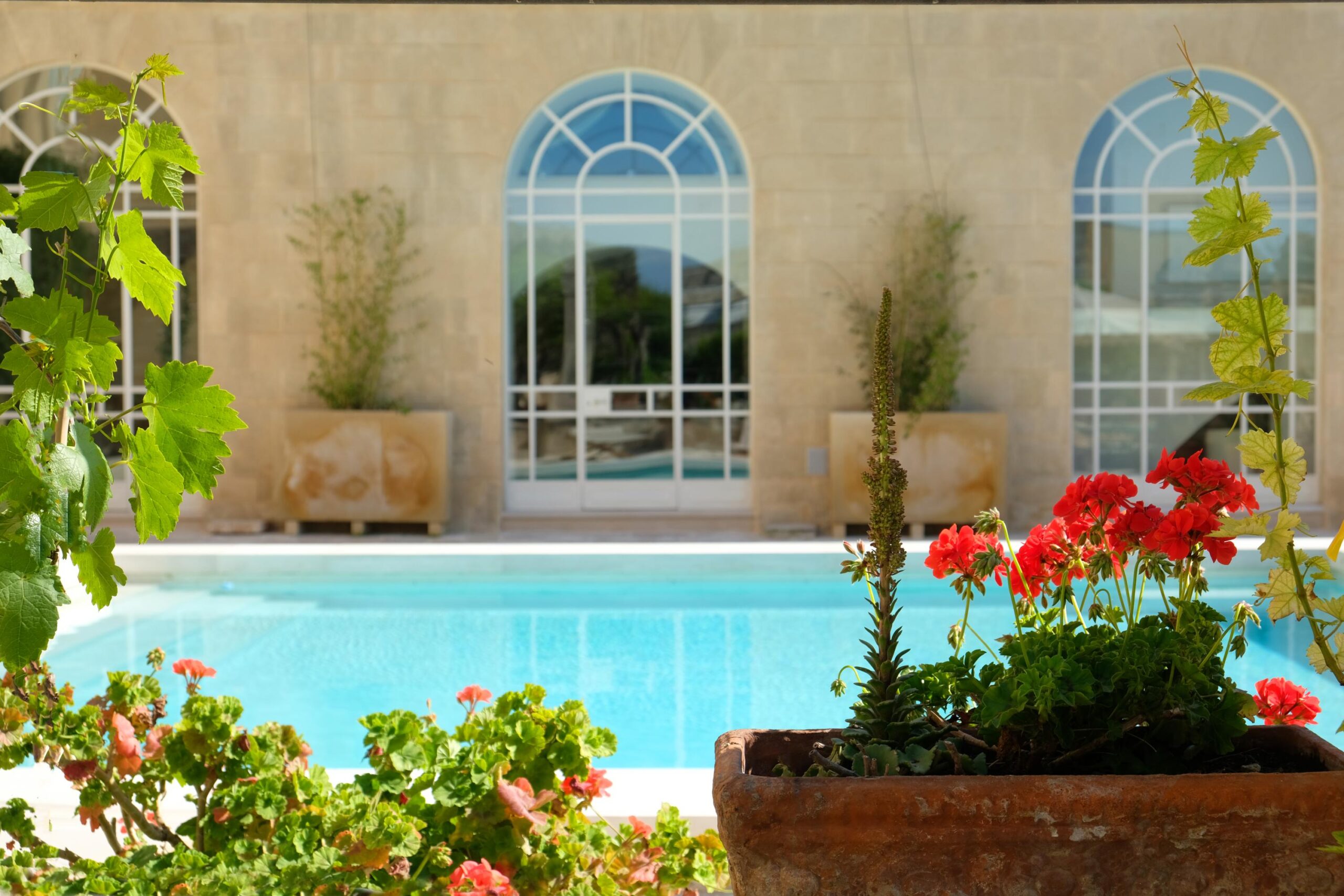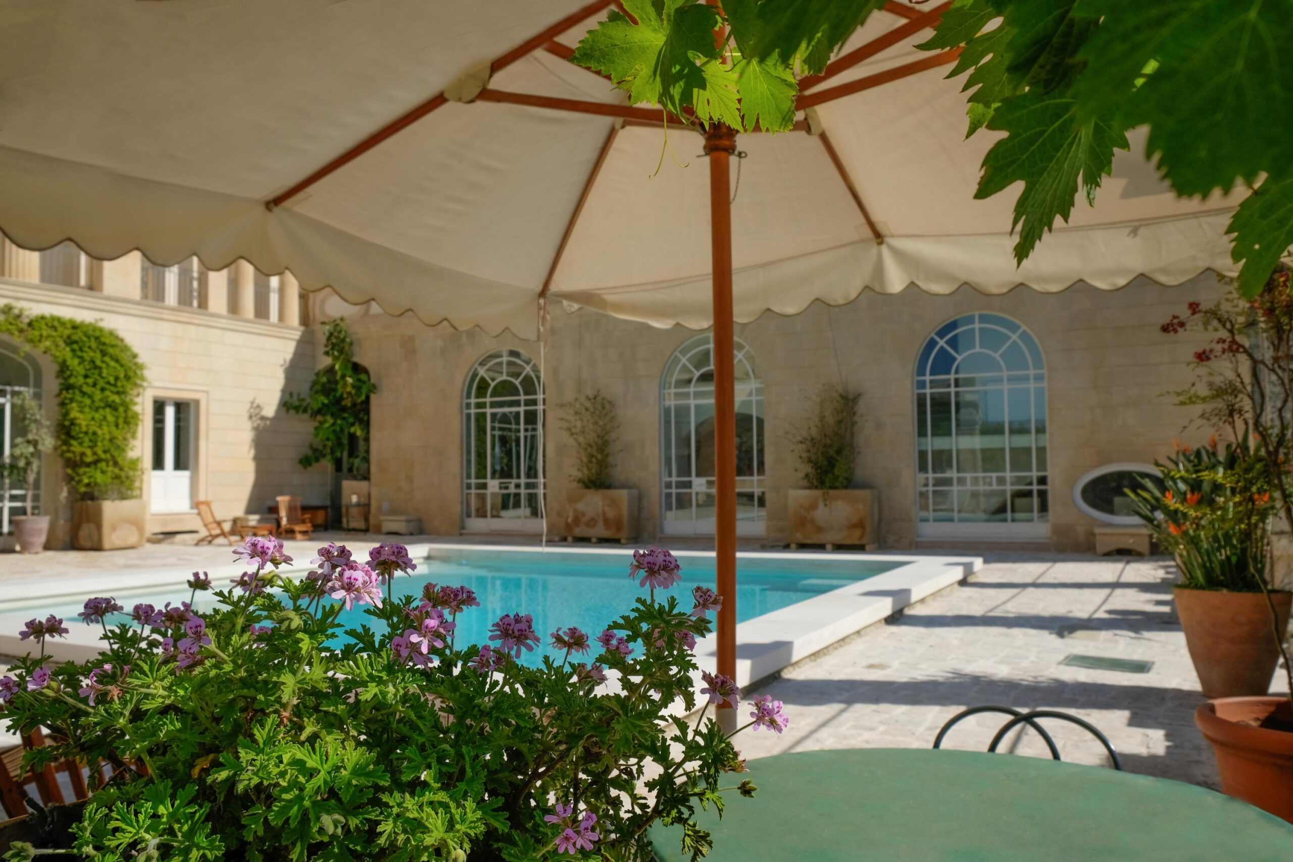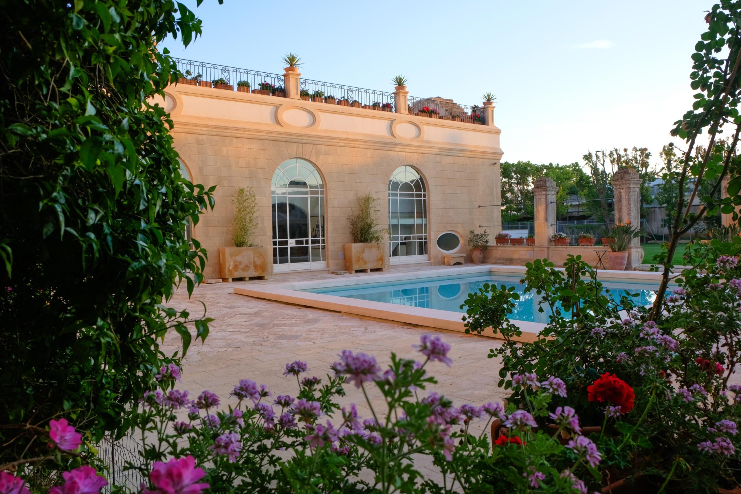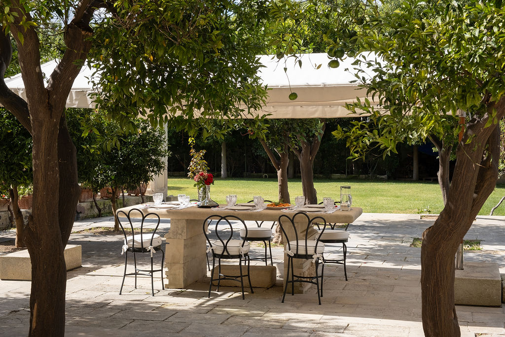 The outdoor spaces of Palazzo Bernardini de Pace blend historic elegance with a refined Mediterranean atmosphere. The central garden, centred around a scenic pool, is framed by local-stone terraces, shaded corners, and fragrant citrus trees.