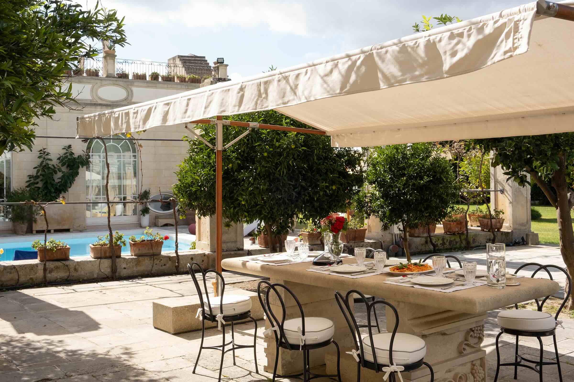 All’aperto, il palazzo rivela la sua anima più autentica: un connubio armonioso tra storia, eleganza mediterranea e quiete assoluta, da vivere in totale riservatezza.