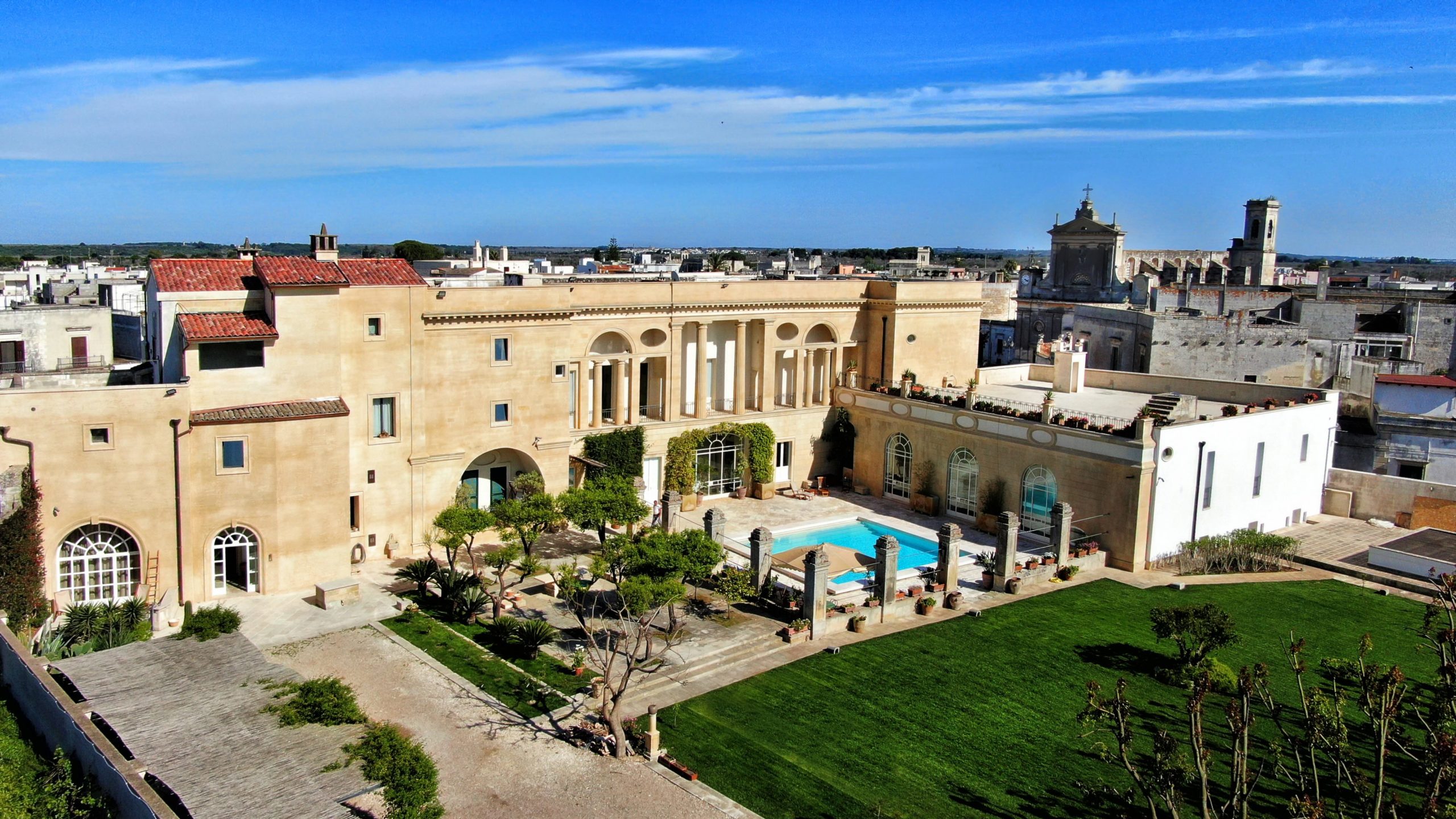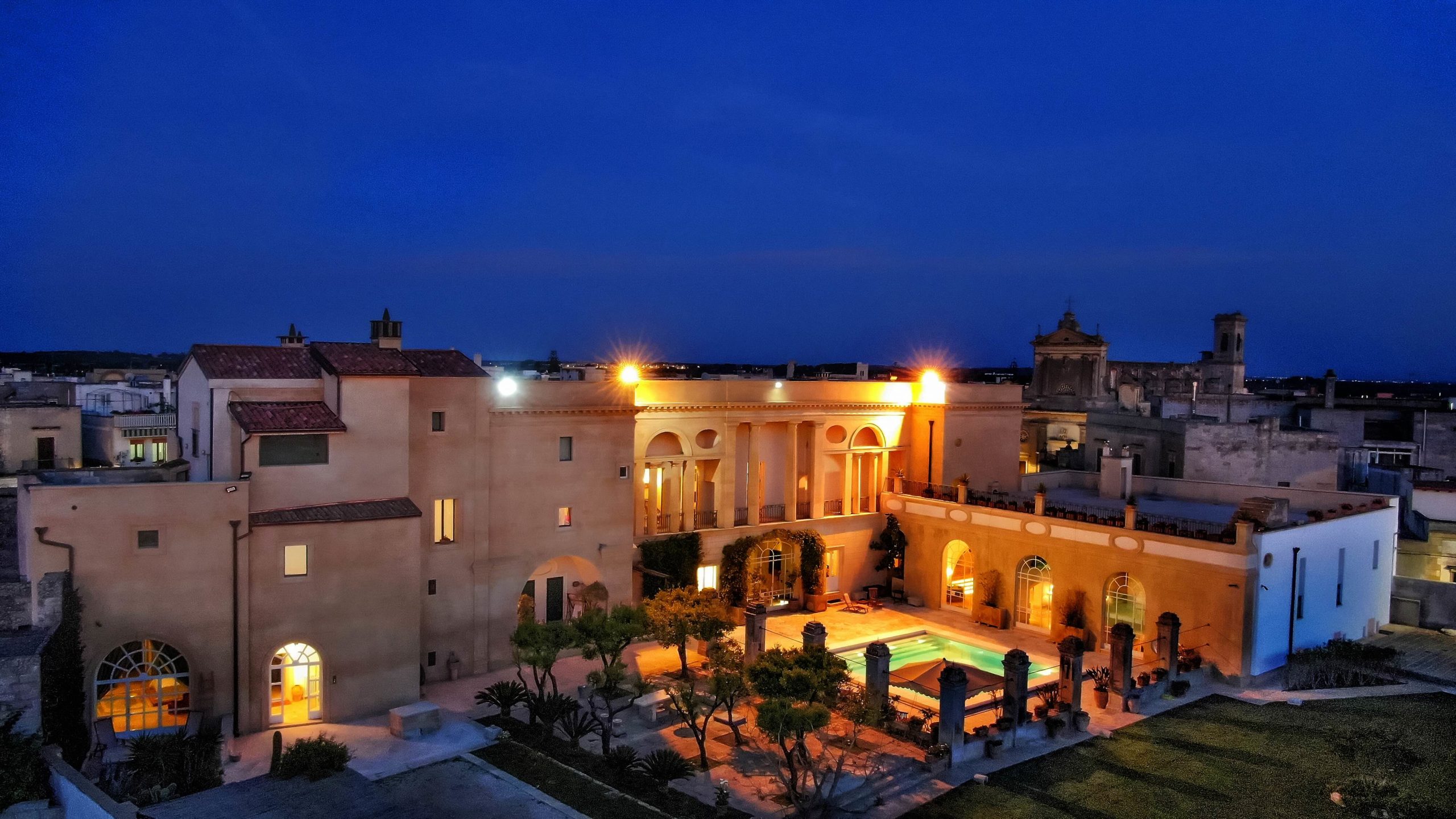 Nel cuore del palazzo si apre il suggestivo cortile murato, un’oasi di silenzio e privacy arricchita da un’elegante piscina quadrata con colonne, zone ombreggiate e angoli dedicati al relax. Dall’alto, le terrazze del piano nobile e del rooftop offrono scorci sulla piazza, sui tetti del borgo e sul paesaggio salentino, scenari perfetti per cene all’aperto e attimi sospesi. Tra spazi monumentali, servizi dedicati e un’anima profondamente artistica, Palazzo Bernardini de Pace è un luogo che sorprende, ispira e invita a vivere il Salento con un’eleganza senza tempo.